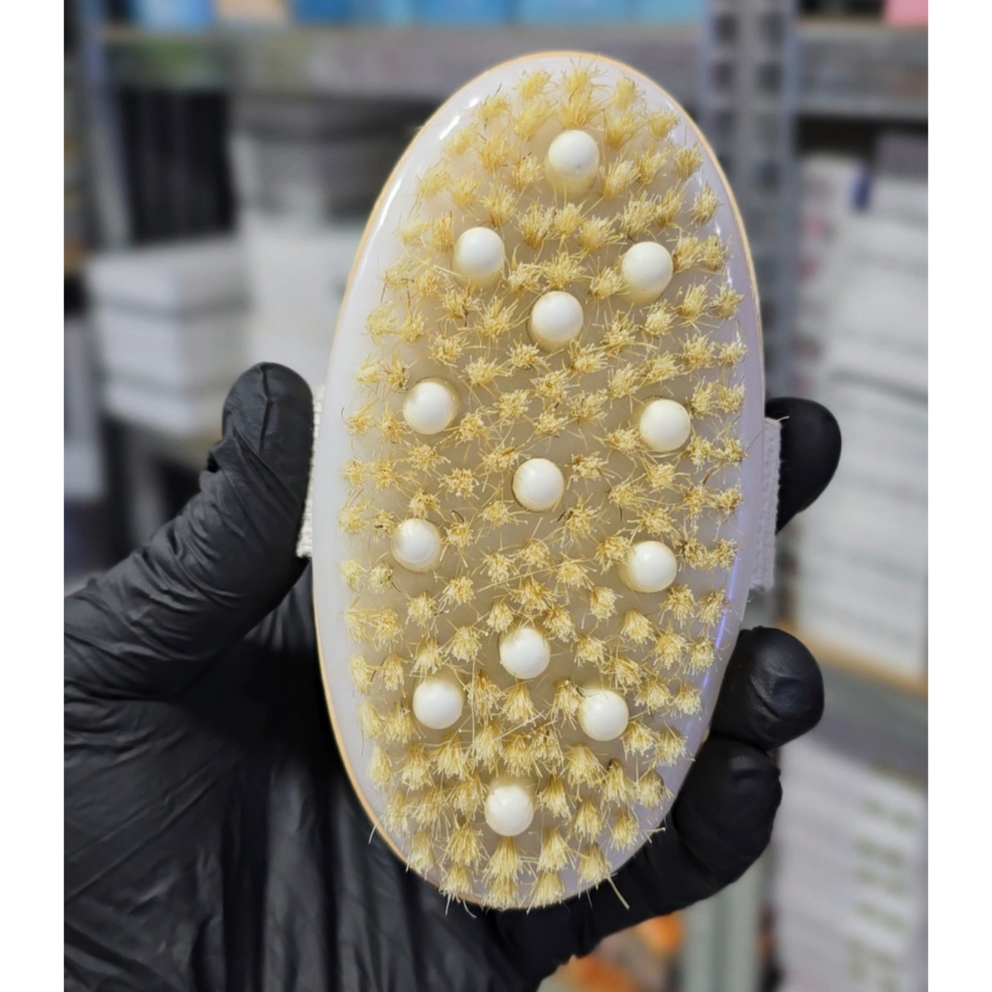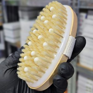 Cepillo exfoliante corporal 2 en 1, con cerdas naturales y nódulos de masaje.