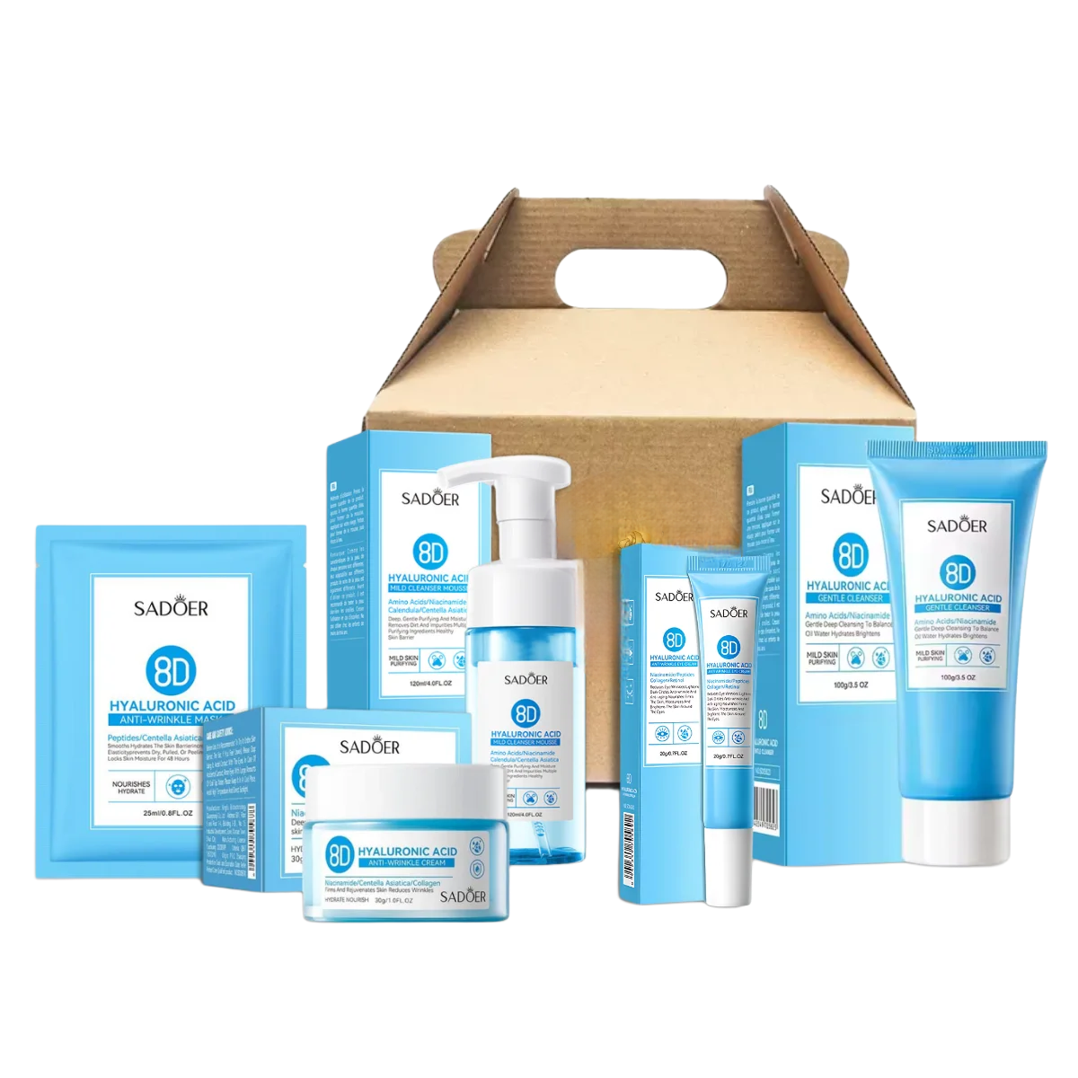 Kit de 5 productos esenciales con fórmula enriquecida con ácido hialurónico 8D para una hidratación profunda, antienvejecimiento y reparación celular. Ideal para una rutina facial diaria completa.